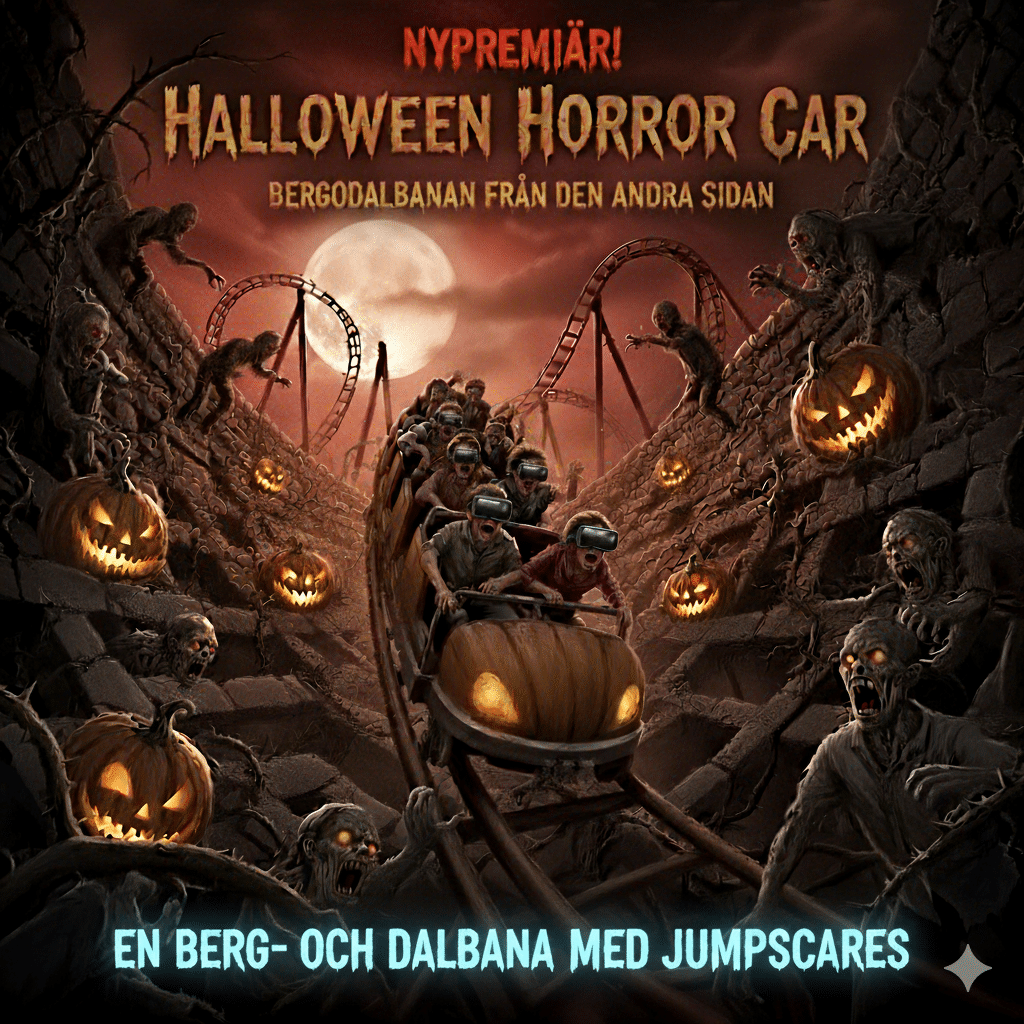 NYPREMIÄR! Spänn fast dig i vår uppgraderade VR-simulator! Halloween Car är vår mest skräckinjagande berg- & dalbana någonsin. Galna loopar, halsbrytande fall och skräckinjagande varelser som sticker ut huvudet vid varje hörn. Håll i dig – det här är en tur du sent glömmer!